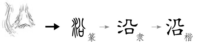 “沿”字本义是指顺着河流漂向下游。字形采用“水”作形旁,“㕣”(yǎn)作声旁,是“谷”的变形,意为山谷。现在,“沿”也指遵循、因袭,如“沿袭”,指依照旧传统或规定办理。
