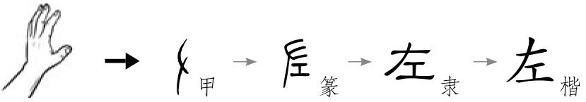 甲骨文中的“左”,两条弯曲的折线一上一下,相互交叉,就像是一个简化了的左手形状,也像是两只手相互紧握的样子。《说文》中说:“左,手相左助也。”认为“左”的本义就是相互协助。后来,人们又造了“佐”字,“左”作为辅佐的意思也就不常用了,而常用来表示方位,与“右”相对。