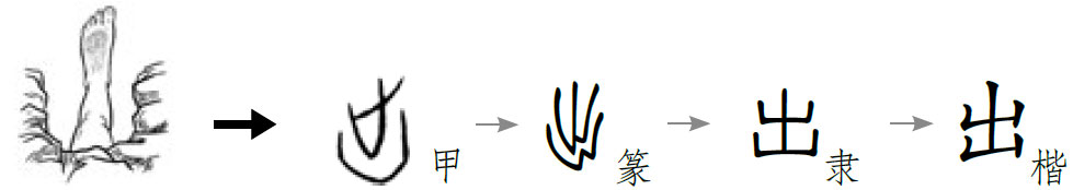 从甲骨文字形上来看,“出”字很像是一只脚从洞口伸出来。因此,“出”的本义为出去,后来引申为“发出”,如“发出信件”“发出命令”等。因为只有出去了,才能显露出来,所以“出”字又引申为出现、显露、展示之义。在体育比赛中,我们常会听到一个词“出线”,意思是在分组比赛中成绩突出,成功进入下一轮比赛。