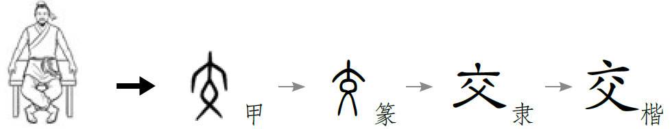 “交”字的字形很像人两腿交叉,因此,其本义是“交叉”或“交错”,引申为结交、交往之义。“交”还是古代的一个郡名,即交郡,设立于汉朝。相传这里的人晚上入睡时,总是双足相交。在现代汉语中,“交”字的本义沿用至今。此外,这个字用作名词,还有友情之义,如“两个人交情甚好”。