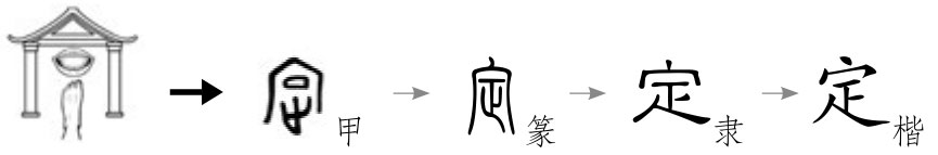 “定”是个会意字,本义是安稳。甲骨文字形的上面是一个房屋的形状;字形内部的上方是“口”字,下方是“止”字,合在一起就是“正”字,意思是房屋内部端正,没有偏斜,人才能安居其中。“定”还引申为约定、确立之义。