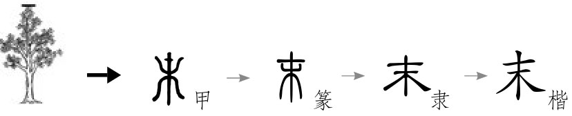 在甲骨文中,“末”字字形很像一棵大树,树的末端有一黑点,代表指事符号,表示这里是树梢所在的地方。因此,“末”字的本义就是树梢。后来,“末”字引申为最后、终了的意思,如“末尾”。另外,由于最后的往往是不重要的,所以又引申为次要的、差一等的,如“舍本逐末”,比喻做事不注意根本,而只抓细枝末节。