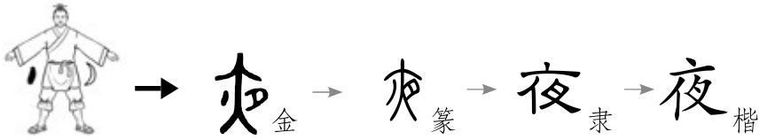 “夜”本义是夜晚,是一个形声字,“月”是形旁,“亦”作声旁。《说文》中解释为:“夜,舍也。天下休舍也。”认为“夜”就是人们都停止了活动,回到房中休息。金文的“夜”字,像是一个站立的人,左边的一点是指事符号,表示人的腋下部位;右边是“月”,表示月亮此时已升到了人的腋下,这也就是夜晚了。
