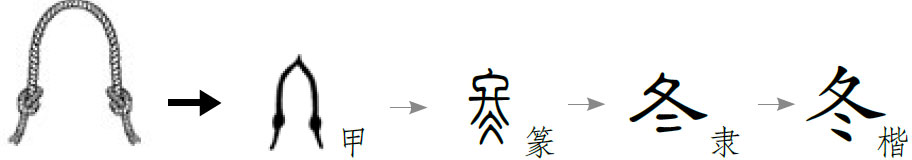 “冬”的基本含义是最后、终了。最初的字形是在一条绳子的两端各打一个结,表示两个极端,也就是“结束”。小篆中,这个字最下边是“仌”,没有太阳只有冰,只能是滴水成冰的冬季。后来,为了书写方便,人们将“仌”简化为两个小“丶”。现在,这个字一般指冬季,是一年四季中最后的一个季节。