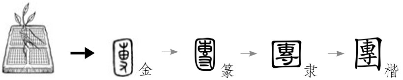从金文字形看,外面是“囗”(wéi),表示围绕;里边是“專”的变形,其上部形状像秧苗长在田里,下部是一只手,表示用手插秧苗。“团”的造字本义是指将秧苗插进圆形封闭的田地中。在现代汉语中,“团”一般指圆形的、球状的,如“线团”。还有凝聚的意思,如“团结”“团圆”等。