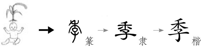同胞兄弟中较年幼的孩子就是“季”。“季”字本义是对同辈中年纪最轻者的称呼。字形由“子”和省略了“隹”的“稚”两部分组成,是一个会意字,“稚”也作声旁。古人称呼兄弟的长幼,以“伯”“仲”“叔”“季”为序。现在,“季”也指时节、时段,如“季节”等。
