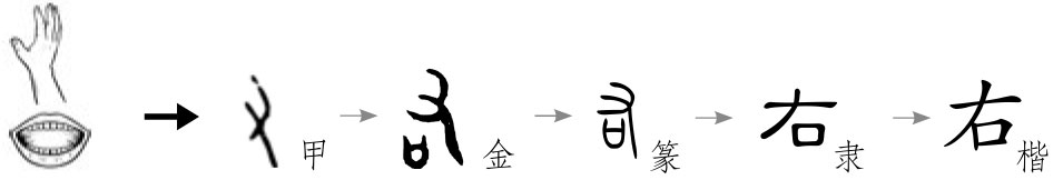 “右”字本义是帮助、协同、辅佐。甲骨文中的“右”,字形与“左”相反。从金文字形看,由“手”和“口”组成,表示上司以言语指导并用右手搀扶。从字形上看,“右”字描绘的是一只右手,所以是右手边的意思。由于其字形是上对下的指导,所以右边也意味着尊贵、升迁。