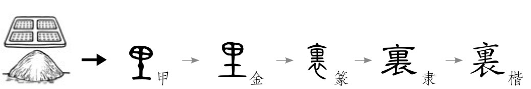 “里”是个会意字,本义是民户居住的地方。古人将山野中建的房子称为“庐”,将村社中的房屋则称为“里”。金文的“里”,字形上方是“田”,代表作物;下方是“土”,代表土地。古人主要从农业活动中获取粮食和各种物资,所以有“田”有“土”才能生存。