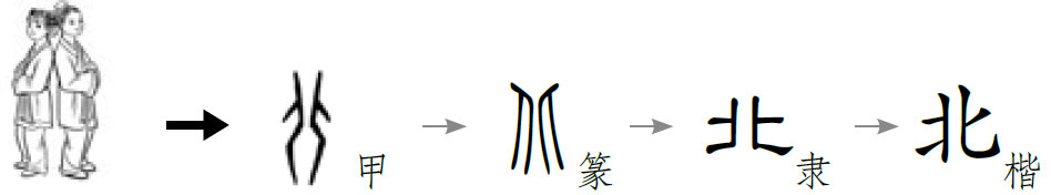 “北”是“背”的本字,其甲骨文字形是两个人背对站立。因此,“北”的本义是相背。在古文中,这个字也指代打了败仗的军队,打了败仗逃跑的行为,称为“败北”。后来,“北”字就逐渐专指方位,即与南相对的北方,如“首都北京位于我国的北方”。