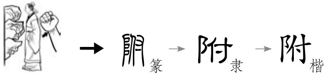 割让土地,作为属国向强国称臣。“附”字本义是指小土山。字形采用“阝”(阜)作形旁,表示与地形地势的高低上下有关;采用“付”作声旁,表示交出。现在,“附”也指顺带的、从属的,如“附近”“附属中学”等。