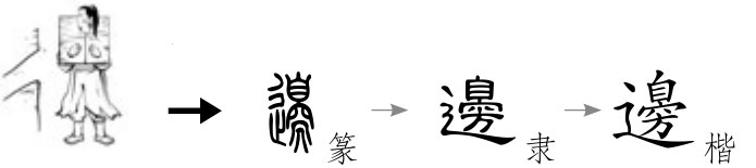 在罪犯脸上刺字,给犯人披上枷锁,并将其放逐到深山边疆做苦力劳动。“边”字本义是指走到接近无路可走的崖岸水际。繁体字为“邊”,字形采用“辶”作形旁,采用“臱”(biān)作声旁。简体楷书将正体楷书中“自+穴+方”的复杂结构简化成“力”。现在,“边”字也指侧面、方面、方向,如“东边”“身边”等。