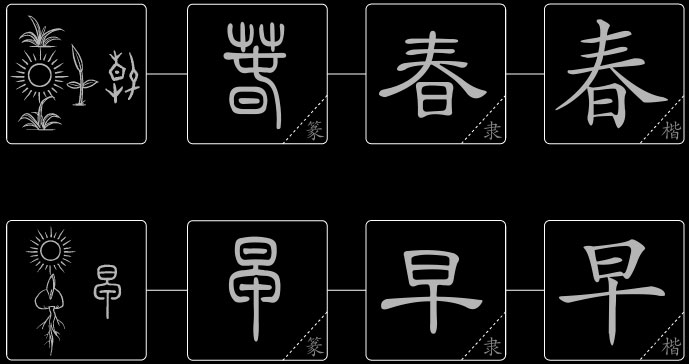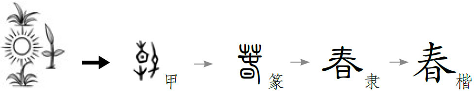 在甲骨文中,这个字是由“日”“艸”“屯”三部分组成的,意味着春回大地、万物生长。“春”最早的写法就是“屯”。“春”还可泛指一年,如高适的诗中就有“一卧东山三十春”的诗句。“春”的这种含义一直沿用至今。