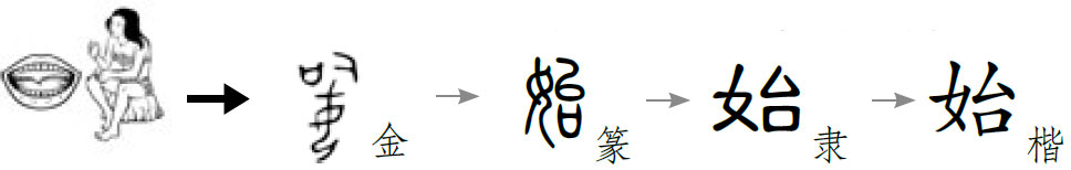 从金文字形看,左边指用口传达信息,右边是“女”。“始”就是指发号施令的女人,引申为最早出现的女人。“始”是描写女人当家的母系氏族社会。“始”具有“最初”的意思,因为万民都由“女”而出,所以祖母在古代家庭里是相当有地位的。《说文解字》将“始”解释为最早出现的女人,也就是人类的祖先。