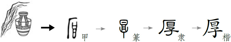 “厚”是个形声字,本义表示地壳的厚实。《说文》认为“厚”字代表山脉的高远。甲骨文的“厚”,字形外部是个“厂”(原写作“”,读hǎn)字,作为形旁,代表它和高山有关;下面是一个酒坛的形状,是声旁。现代汉语中,“厚”还引申为情意深厚。