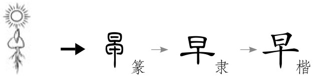 “早”字本义为早晨。在小篆文中,其字形上边为“日”,下边为“甲”。“甲”字的古文字形像“十”,看上去像种子皮开裂的样子。这里是说,天将破晓,太阳冲破黑暗就是早晨。后来,“早”字又引申为副词,意思是时间靠前的,与“晚”相对,如“早退”“早逝”。“早”用作形容词,意为在平生的早期、在年轻时,如“他早年当过兵”。