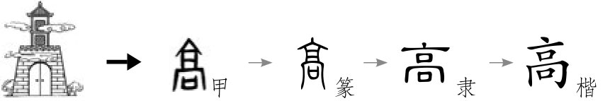 在甲骨文中,“高”的字形与重重叠叠的阁楼形状十分相似,中间部分为城楼,最下方有一个“口”,用来表示城门。可见,这是用高楼来表示“高”字的本义。很显然,这个字的含义与“低”相对。现代汉语中,“高”常用来形容地位、学问或是品德。