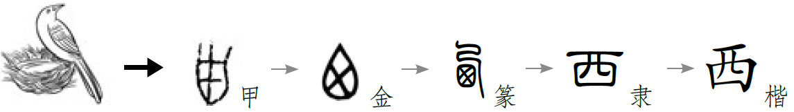 “西”是“栖”的本字,在甲骨文和金文中,其字形就像是一个鸟的巢穴。篆书中,上面加上了一个省略写法的“鸟”字,更清晰地表明了这是一只鸟儿正在自己的巢穴中休息。因为鸟回巢的时间一般在太阳落山之时,而太阳落山的方向是西方,古时并没有代表西的方位字,所以人们就借用这个字形来表示方位中的西方。
