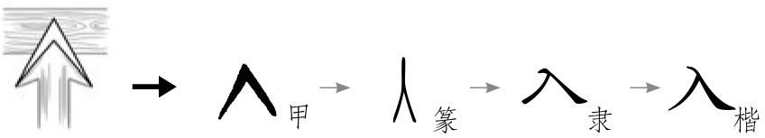 “入”是个象形字,本义是从外面进来。《诗经·唐风·山有枢》中“他人入室”,意思就是他人进入你的家中坐享其成。甲骨文的“入”字,形态就像是一根箭矢或刀具前端的锋利处,用这种利器就可以射入或刺进物体的内部。“入”还引申为参加、加入、交纳之义。该字用作名词,意思是收入,如“入不敷出”。