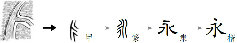 “永”字也是“派”的本字。“派”的左边三点,古代就写作“永”。从甲骨文的字形看,上游是一条大河,下游派生出了几条小的支流,显现出河水流淌时曲曲折折的样子。由此可见,“永”的本义就是漫延的流水。后来,“永”还通“咏”,表示声音的延续时间长。现在,“永”的常用义为久远,如“永远”“永久”。