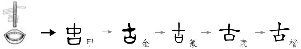 “古”字本义是古代。甲骨文的“古”,字形上边是加了“口”的“十”,表示数量很多;下方的“口”字,表示话从人的口中说出。合在一起的意思,就是祖祖辈辈口口相传,即为“古”。金文的“古”字,上部变成了“十”,下方还是个“口”字。现代汉语中,“古”常用来表示一个人思想僵化、不知变通,如“古怪”“古板”等。