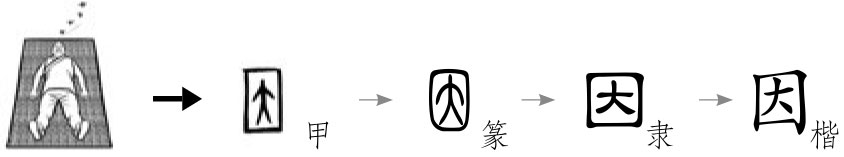 甲骨文的“因”字,中间一个“人”字,代表人;外围是一个大“口”,代表大床。“人”和“口”两字内外相连,就像是一个人正平躺在一张大床上。从这里看出,“因”字的本义就是一张床褥或坐垫。坐垫可以倚靠,所以“因”也引申为根据、凭借。现在“因”常表示缘由、原因。