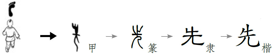 一只脚放置在一个人的上面,这个脚的形状就是古时的“止”字。“止”是“脚”的本字,“脚”字有行走的意思。将“脚”和“人”的古字形上下相连在一起,意思是说上面这个人的脚已经跑到了别人的前面。后来,“先”用来表示时间的先后顺序,也常常被用在对已故者的称呼中,以表示尊敬,如“先帝”“先祖”等。