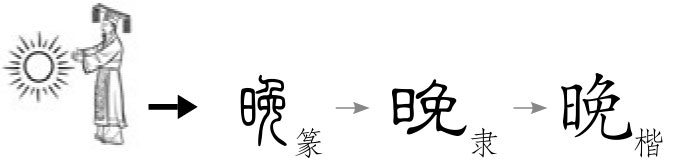 “晚”字本义为傍晚、黄昏。其字形左边为“日”,表示字义,说明与太阳有关;右边为“免”。对整个白天来说,黄昏是最后结束之时,所以后来“晚”引申为某一时期的后段,如“晚年”“晚期”“晚节”。现在,“晚上”指从日落黄昏到深夜之前的这段时间。它还常常与“早”相对。年轻人在长辈面前自称“晚辈”。