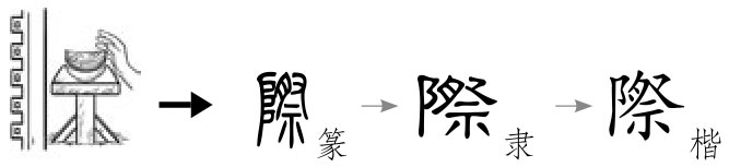 “际”字本义是指岩壁交接的地带。字形采用“阝”(阜)作形旁;“祭”作声旁,表示敬拜祖宗神仙。古人在两邑地界的路边设祠敬拜,以求一方水土的安康幸福(该传统沿袭至今)。现在,“际”也指汇合、遇合,如“际遇”等。