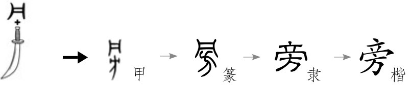“旁”是个形声字,本义是广阔的四方之地。甲骨文的“旁”,上边的“凡”是形旁,表示一切;下边是“方”,既作声旁,也是形旁,表示地方。合起来就表示所有的地方。“旁”后来常作为“傍”的通假字,意思是两侧。现在,“旁”常表示附近,如“旁边”“两旁”“旁人”等。