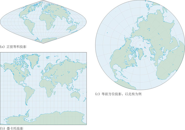 地图投影 (map projection)一词就表明了将地球仪曲面描绘到平面地图上的方法。所有平面地图都以不同方式在不同程度上扭曲了真实地球表面下述四种主要属性的一部分或全部:面积、形状、距离和方向。图2.5举例说明了一些地图投影固有的变形。