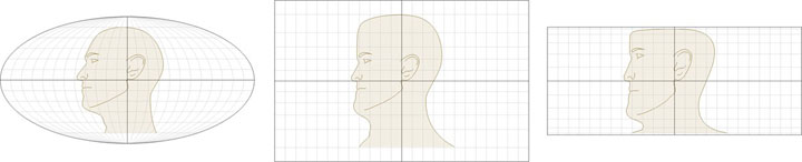 图 2.5 本图表示三种不同地图投影固有的变形。