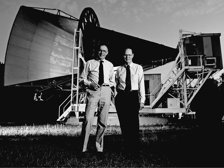 1964年,答案突然出现了。天文学家阿尔诺·彭齐亚斯(Arno Penzias,生于1933年)与罗伯特·威尔逊(Robert Wilson,生于1936年)在新泽西贝尔电话实验室工作,他们正努力为卫星传输建造一种超敏感的接收器(参见图1.8)。为了改善设计的号角式天线,他们试图消除所有的背景信号。他们发现了一种微小的、持续存在的以及均匀的背景噪音,并且根本无法清除它。很显然,这种噪音存在于天线指向的任何方向,因此,它似乎并非来自太空中某个特定天体。他们一开始怀疑自己的装备出现了问题,一度将天线上的鸽子粪便清理一番,以防鸟粪散发的微小热量是噪音的来源。最后,他们与附近普林斯顿大学物理学教授罗伯特·迪克(Robert Dicke,1916-1997)取得联系。迪克很清楚那些预测,即大爆炸释放出了巨大能量,而且他当时正在设计一种能够探测这种背景能量的射电望远镜。他马上断定,彭齐亚斯和威尔逊检测到了加莫夫和其他人预测到的古老能量的片羽吉光。