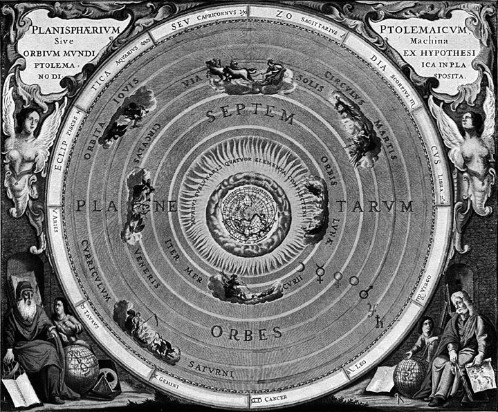 在中世纪欧洲,大多数学者接受古埃及天文学家托勒密提出的宇宙观:地球是宇宙的中心,四周是旋转的载有天体的透明圆圈