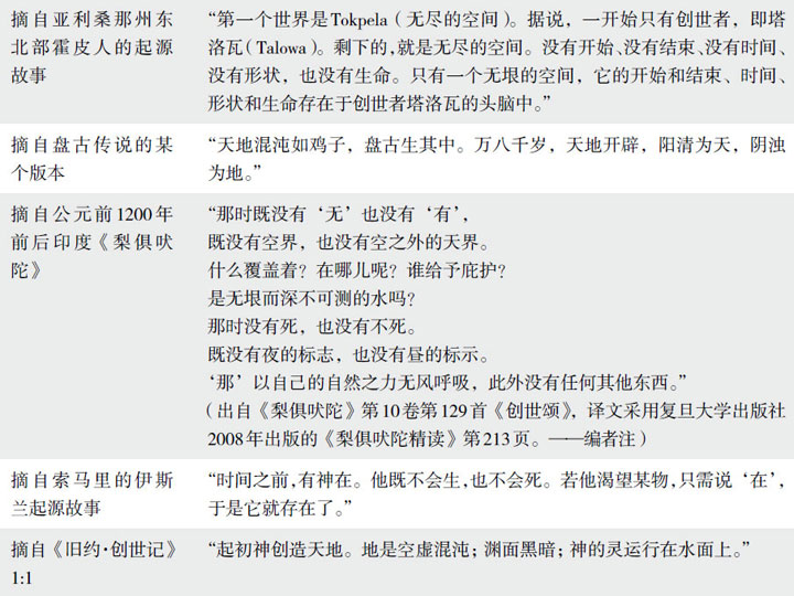 表1.1的文字摘自一些传统起源故事的开头。尽管彼此存在差异,不过,这些关于万物起源的叙述,也具有一些重要的共同点。