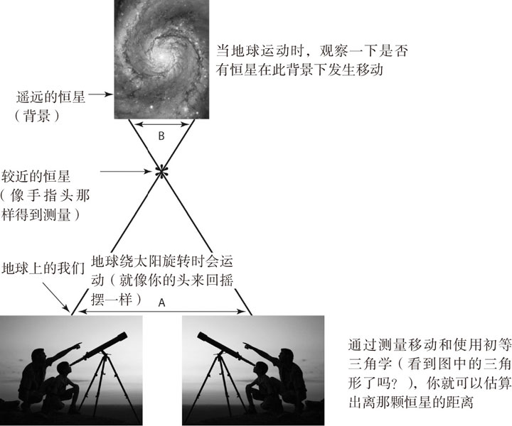 为了更好地了解视差是如何运作的,可以将一根手指头放在眼前靠近鼻子的位置。先不要移动手指头,只是来回摆动头部。这种情况下,你的手指头似乎在移动;它移动的距离取决于它与眼睛的距离。(让手指头远离鼻子,然后摆动你的头来检测一下。)希腊人意识到,这条简单原则使得人们能够测量地球到最近恒星的距离。当地球每年绕太阳旋转时(记住,一些古希腊天文学家接受了太阳中心的宇宙模型),一些最近的恒星肯定会在更遥远恒星的背景下运动,就好像你在摇动头部时,手指头的运动那样。通过测量较近恒星在较远恒星的背景下移动了多远,并且通过使用初等三角学(结合对地球轨道的尺寸、地球到太阳之距离的大致估算),你就能够估算出这些恒星有多远。