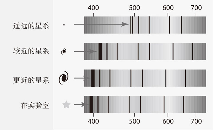 19世纪末,亚利桑那州弗拉格斯塔夫市洛厄尔天文台(Lowell observatory)的维斯托·斯里弗(Vesto Slipher)发现了吸收线的另一个奇异特征。在遥远天体的光谱中,吸收线似乎偏离了它们的预期位置。因此,代表氢元素的吸收线可能是蓝移的(在光谱线上移向更高频率的蓝端)或红移的(移向低频率的红端)。斯里弗认为,这种移动是恒星向我们移动(蓝移)或远离我们(红移)造成的。它们是由 多普勒效应 (Doppler effect)引起的,这种效应似乎也引起警笛的声音在向我们移动时频率上升,在远离我们时频率降低。这种效应产生的原因在于一个事实,即当发出声音的物体向我们移动时,我们感觉声波正在聚集起来,当它远离我们而去时,声波似乎扩散开了。如果斯里弗是正确的(我们现在知道他是正确的),那么,我们就可以确定遥远的物体(比如遥远的星系)是向我们移动还是离我们远去。我们甚至能够计算出它们运动的速度有多快。这是一个非凡的技术成就。