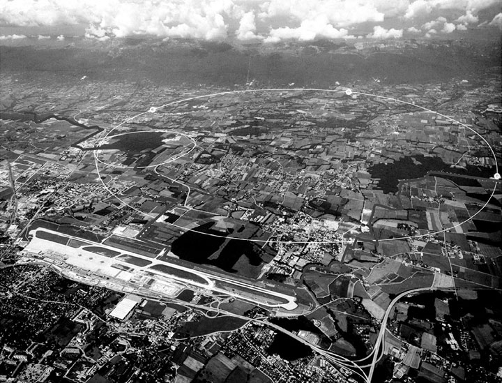 大型强子对撞机是迄今为止设计出来的最庞大、最昂贵的科学实验。它由日内瓦机场下面一条巨大隧道构成,亚原子粒子在那里以接近光速的速度被击碎,以便发现它们的构成。这好像将汽车一起捣碎以观察它们的内部构成,不过,这是我们用来确定宇宙构成基本成分的本质的唯一方式。白圈标出了 LHC 的位置。前面是日内瓦机场。红线标示的是瑞士和法国之间的边界