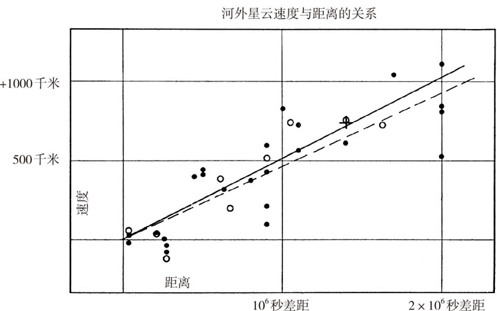 图1.6 哈勃关于遥远星系的距离和运动图表。