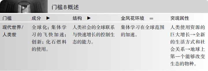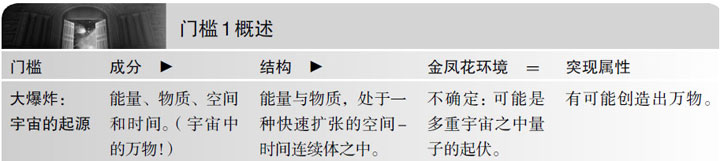 门槛概述 为了讲述138亿年的历史,本书的作者找出了八大突破,每一次突破都意味着某种全新事物的出现。他们将这些突破称为 门槛 。当这个故事到达一道新门槛之际,他们都会用一张表格来形象地概括那道门槛的主要成分。下面是第1章和第11章的例子。