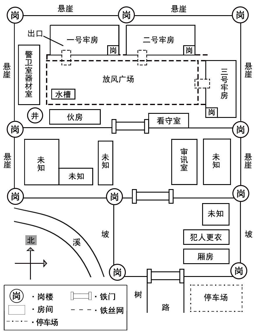 可以看出来,标注着一、二、三号楼的房子就是牢房,而从牢房到小广场,只有唯一的通道,也是被同样两人高的铁丝网隔离着。