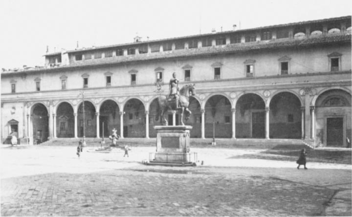 不久,在佛罗伦萨一些主要教堂的外面又造了不少公共广场,其中多数都围着有柱的或有拱顶的回廊。勃鲁奈勒斯契的育婴堂是他在佛罗伦萨修建的第一座公共建筑,它再次说明艺术家有心要把建筑物和它周围的环境协调起来,并考虑公众的需要。