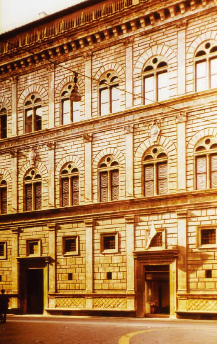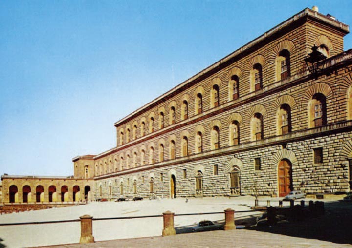 但阿尔贝蒂的杰作只是个孤立现象,其他公馆都维持水平条的传统式样,便于以后扩建。以皮蒂公馆为例,它在1458年为卢卡·皮蒂修建,可能是由勃鲁奈勒斯契设计的,原设计只有七个门洞。16世纪它成了托斯坎尼大公爵美第奇家的官邸,于是就扩建成今天这个样子,有十一个门洞。