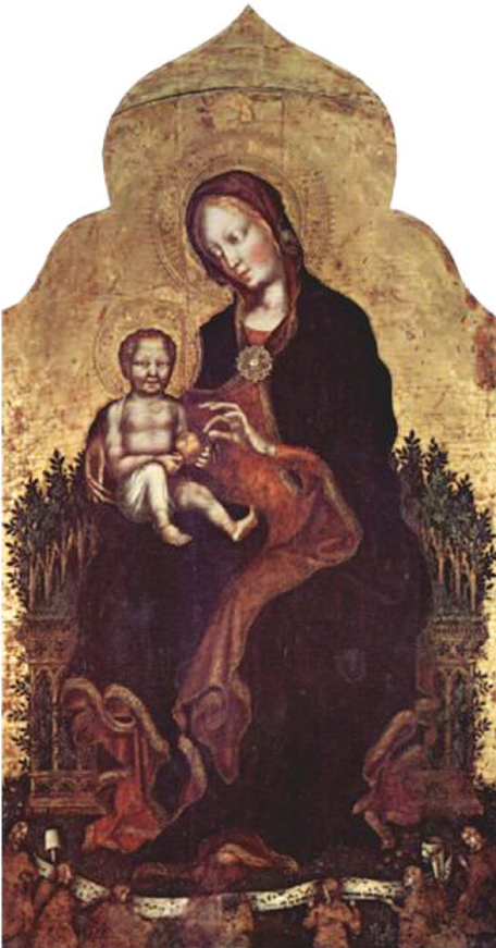 第一幅画中,圣母脚下的天使手持乐卷,放声颂唱,圣母坐在枝叶繁茂的翠亭中,圣婴手中拿一颗安石榴。从天使那抑扬顿挫的轻快“韵律”以及苍葱的绿树和象征人类的小人像,真蒂利把我们引入神的庄严“慢板”中。圣母和圣婴像幻影般升起,优雅但平淡无奇。他们的背后是象征天国的金色背景,他们的身体呈锥形,巧妙地与框架的形状配合在一起。