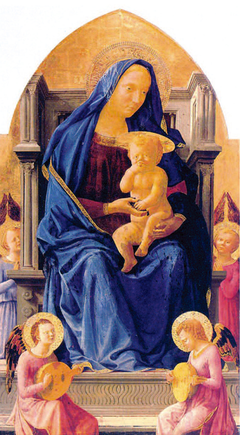 现在我们来看马萨乔的圣母加冕,这儿有全然不同的音乐场面。两个天使坐在宝座脚下弹琵琶,右边的那个刚拨动一根琴弦,按瓦萨里的说法,看上去“正侧耳倾听他弹出的乐声”。天使的大小尽管与圣母、圣婴比相差甚远,但已经大到能和我们进行个人交流了,因此全不像真蒂利笔下的渺小天使。往上看,圣母玛利亚有一张平凡但充满母性的脸,她把孩子舒舒服服地放在膝上。孩子一手拿一颗葡萄在嘴中吮吸,一手在他母亲手中的葡萄串上乱抓。和前一幅图中的安石榴一样,葡萄是基督后来受难的象征,圣母忧伤的目光表示她知道他将来劫数难逃。但除开这未卜先知的神秘感外,马萨乔把这对母子画得尽可能逼真。孩子摸索找嘴的动作,他悬在空中的双腿和双脚,以及画面中呈现的温情暖意,都把天上的神带进人间俗界。我们可以领会他们的一些感情,可以体会到玛利亚的忧伤和婴孩及天使的安宁静谧。