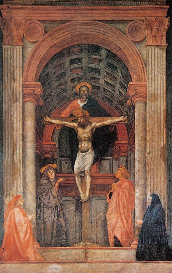 大约在1427年,马萨乔为佛罗伦萨新圣母玛利亚教堂作的壁画《三位一体》正式揭幕了,那时,这个教区的居民一定是带着极其惊奇的目光看着他们教堂墙上的这幅画。画看上去就像在墙壁上掏了个洞,洞中又筑了个壁龛,壁龛里正在显现一件神迹,其中两个佛罗伦萨人——施主们,正虔诚地静默跪立,仿佛因亲眼看见神灵的降临而惊呆了。