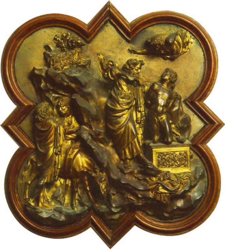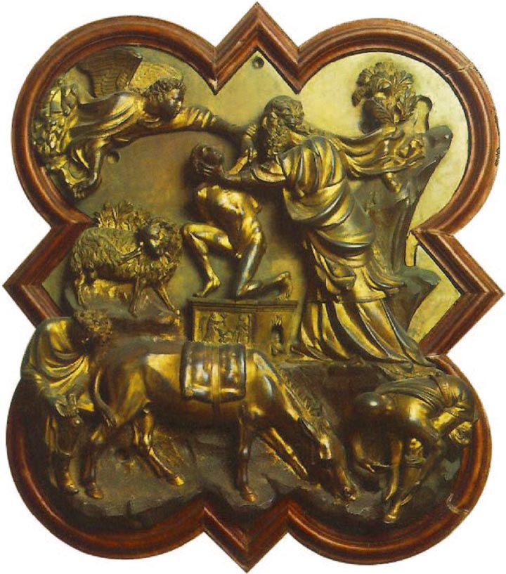 评委会一定是把以撒作牺牲的故事描述得很详细,因为至今仍保存在佛罗伦萨巴杰罗博物馆的两块参加竞争的铸板,其场面完全一致。亚伯拉罕站在山顶上,正要把他的儿子以撒杀了敬神,这时突然从天上飞来一位天使阻止了他,指着一只羊让它代以撒受刀。两个仆人在一条溪边侍候,一头驴正在溪中喝水。在这么小的画面上表现出这么多内容,就使艺术家们面临着既要叙述清楚又要布局奇巧的大问题,他们不仅要详细表现故事的地点,而且要表现事件发生的那一瞬间。