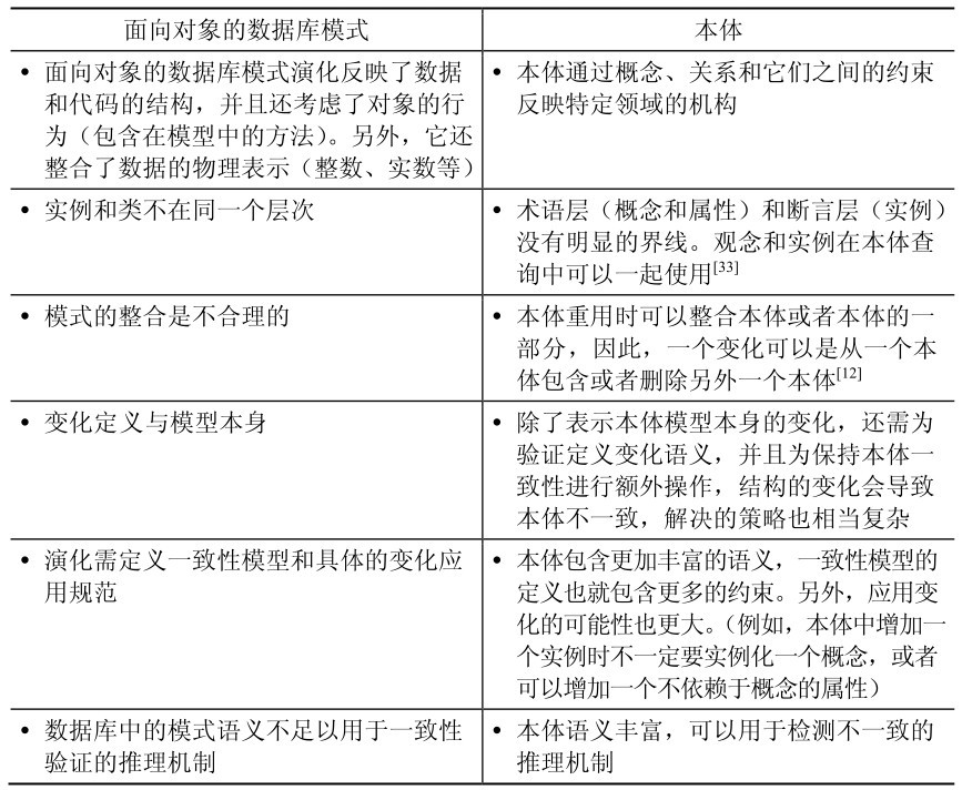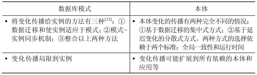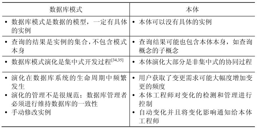 数据库中的模式演化一直是热点的研究课题 [27~30] ,本体演化和数据库的模式演化有密切的联系 [27] ,尤其是面向对象的数据库 [31,32] 。表1-1对比了数据库模式和本体在实例、查询上的不同特点,二者的演化条件有所不同,但在变化传播方面,数据库模式变化影响的控制要么是通过维持相容性规则完成,要么是通过基于公理的推理机制完成 [33] ,而本体变化要将这两种方法结合起来使用。