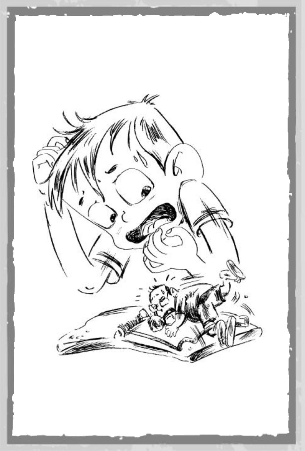 我找了半天,没有找到老鼠,却看见我那像拇指一样大的爸爸正趴在床头柜的台灯下,四肢着地。他的手弯成了爪子状,不停地刨桌面。他的嘴巴大张着,用牙使劲地啃木头,看起来跟老鼠似的。