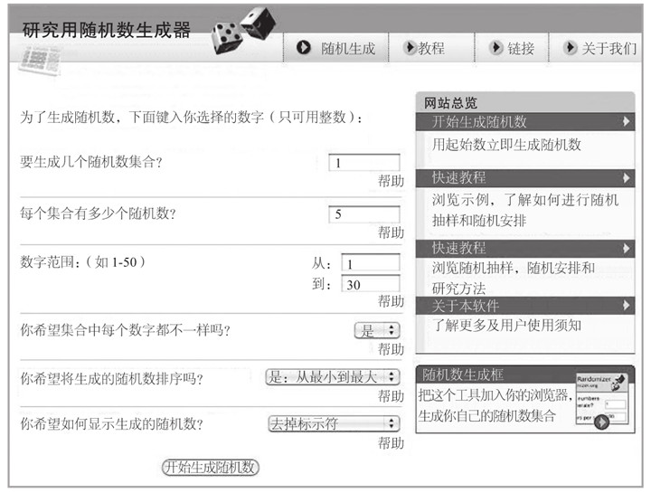 重复完成例3的任务,我们让Research Randomizer随机工具抽取5个数字。数字范围是1~30,要求每个数字都是唯一的,排列顺序是从小到大,选中的数字是非标签的形式(图2–1)。然后,点击Randomize Now按键,得到数字4、7、14、16、23。