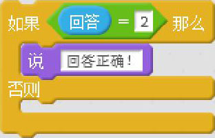 程序块,将“Hello!”改成“回答正确!”,然后拖动到“如果,否则”中间。